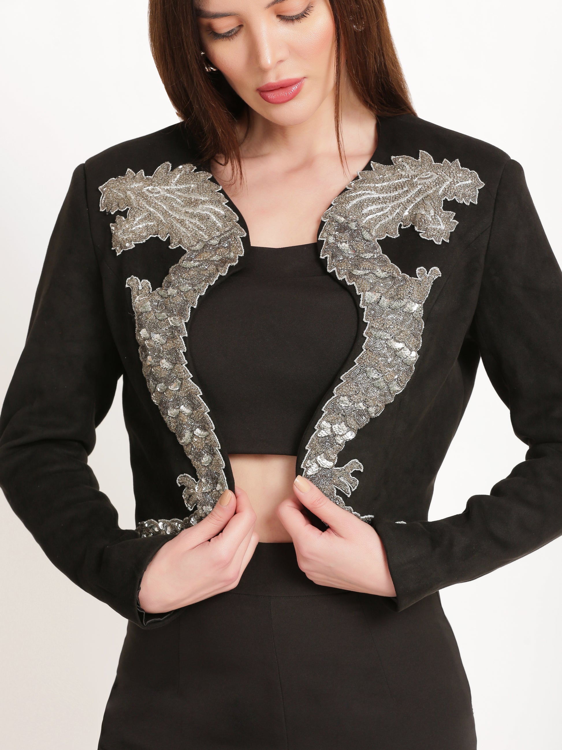 A sleek black three piece suit featuring a flared pant and cropped jacket with striking snake-inspired embroidery for bold sophistication.