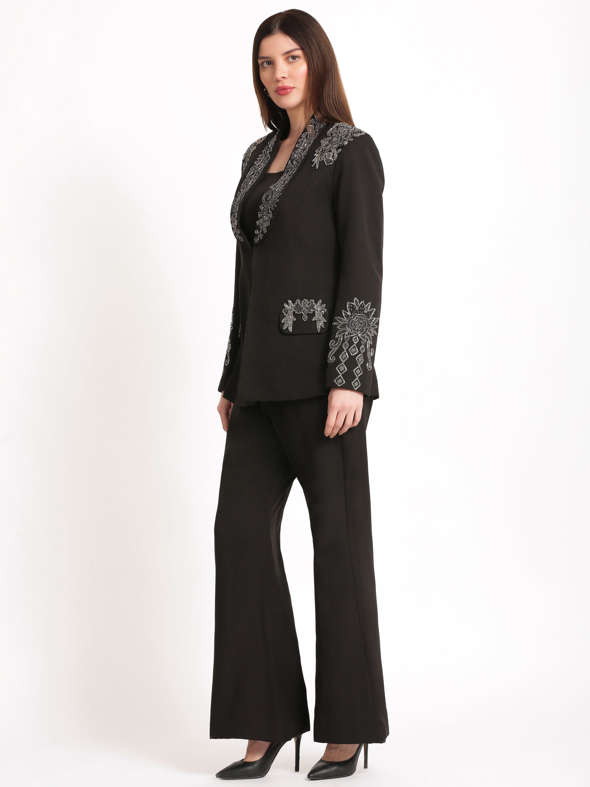 Elegant black blazer with intricate gun metal embroidery on lapels, shoulders, and pockets, offering a sophisticated and timeless look.