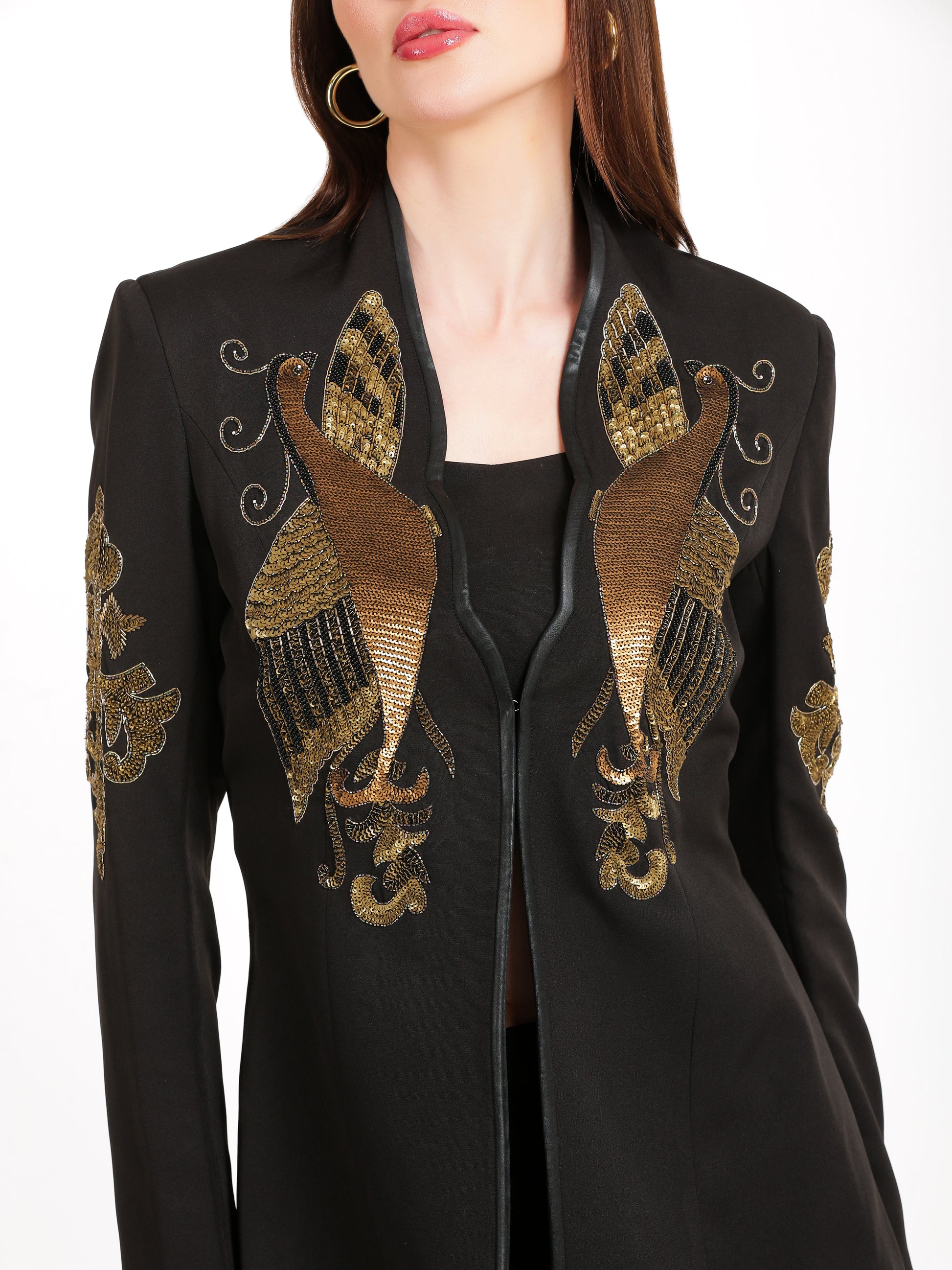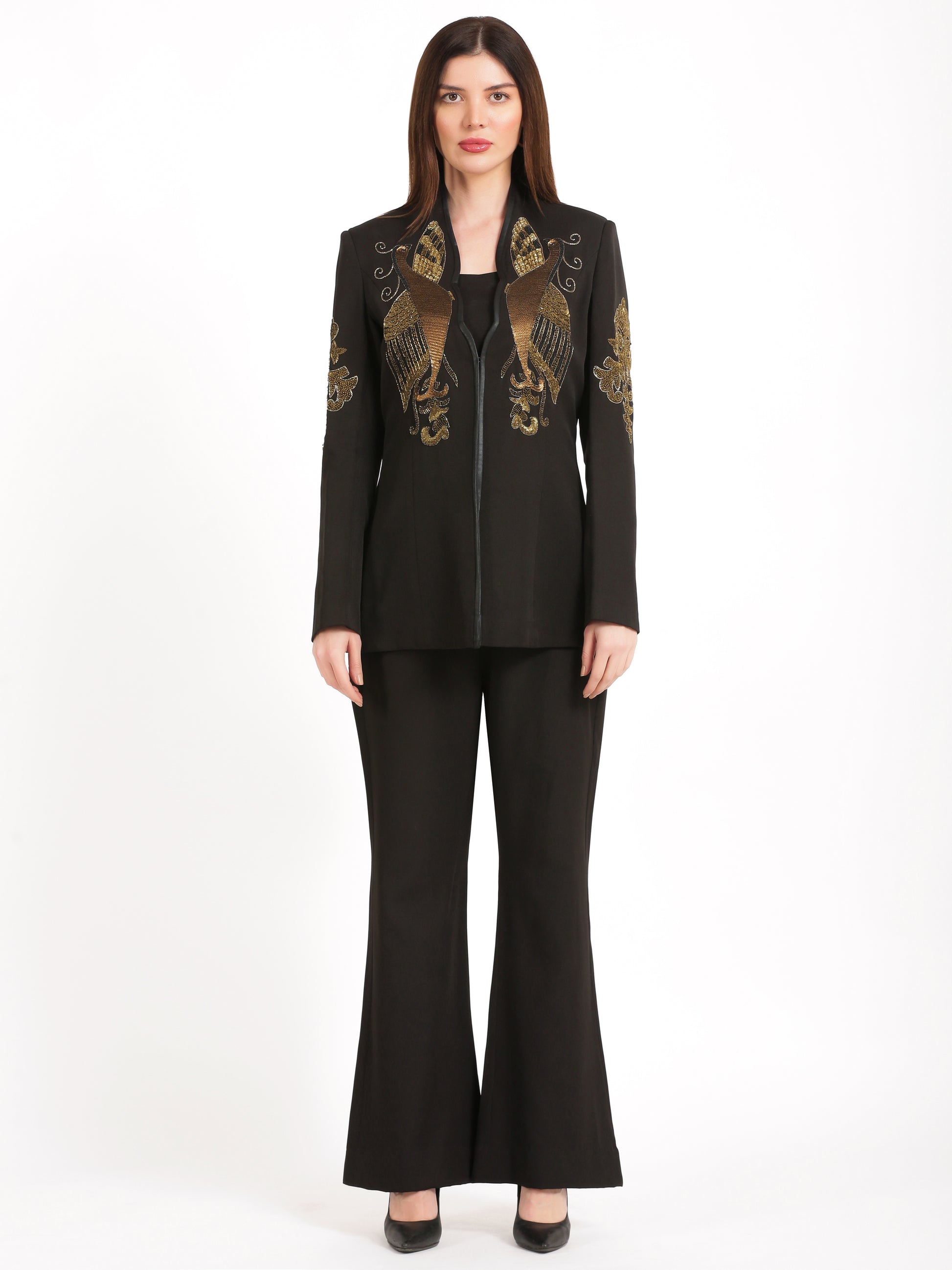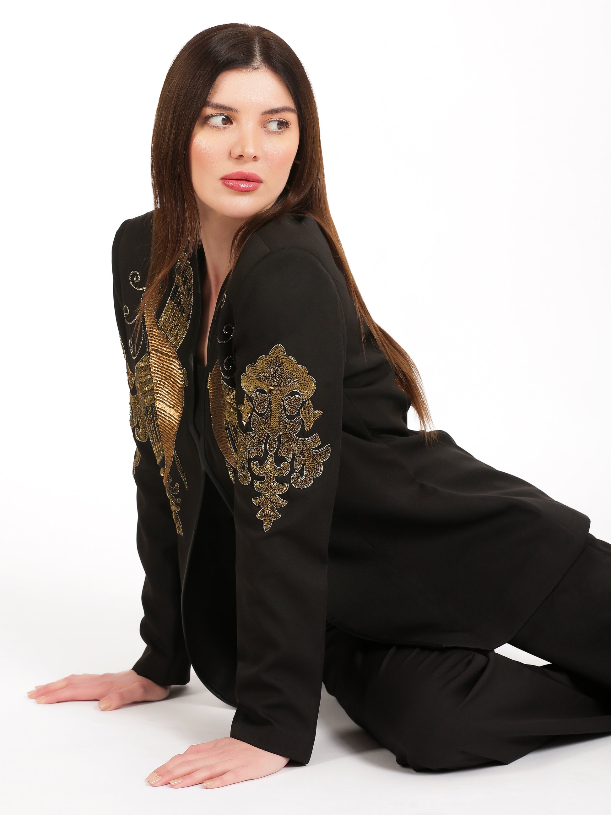 Sophisticated black blazer set with gold sequin detailing and wide-leg trousers, perfect for formal occasions and statement style.