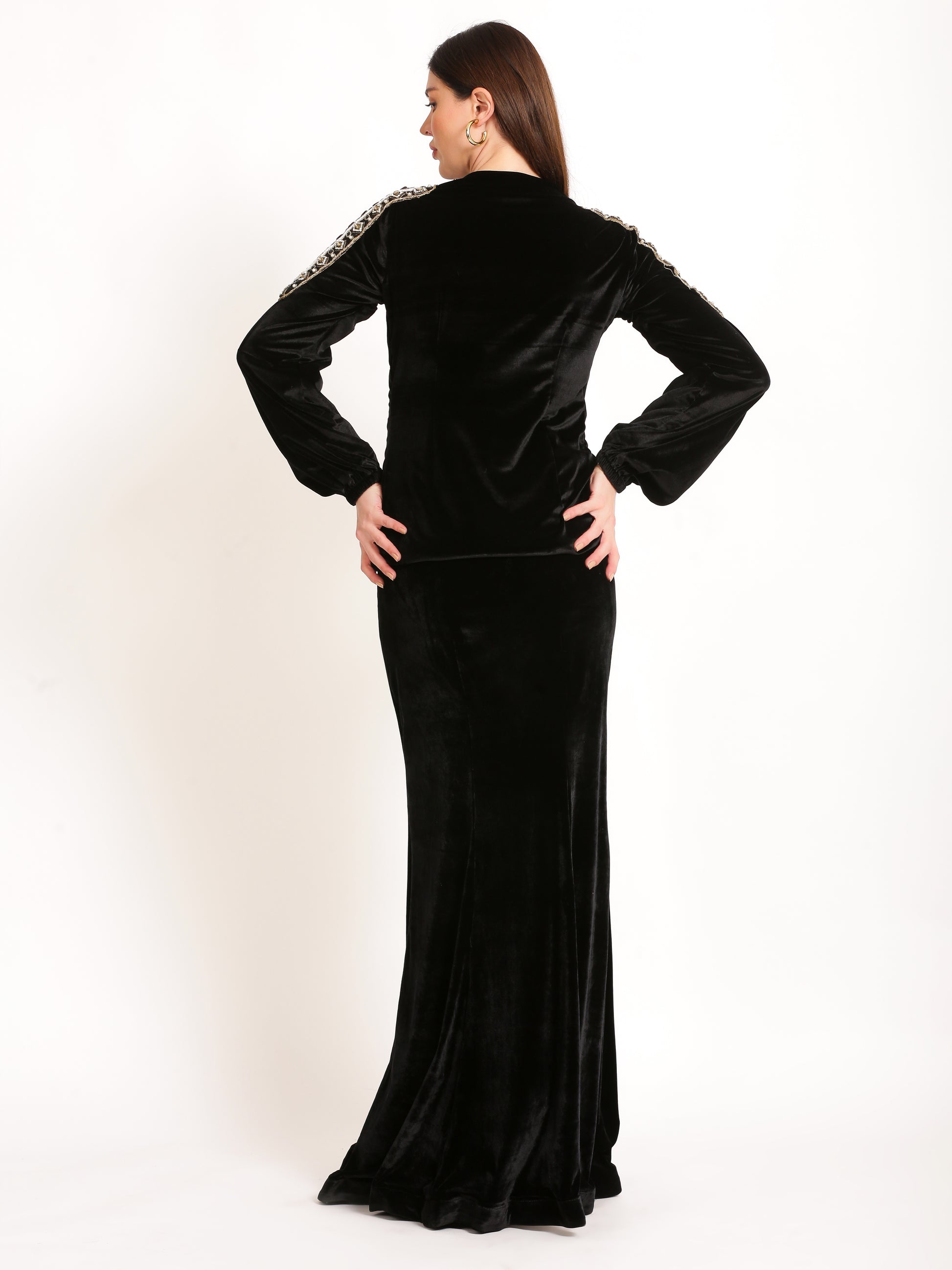 This bold black dress features a beaded corset bodice, pleated sleeves, and a sleek faux leather wrap skirt.